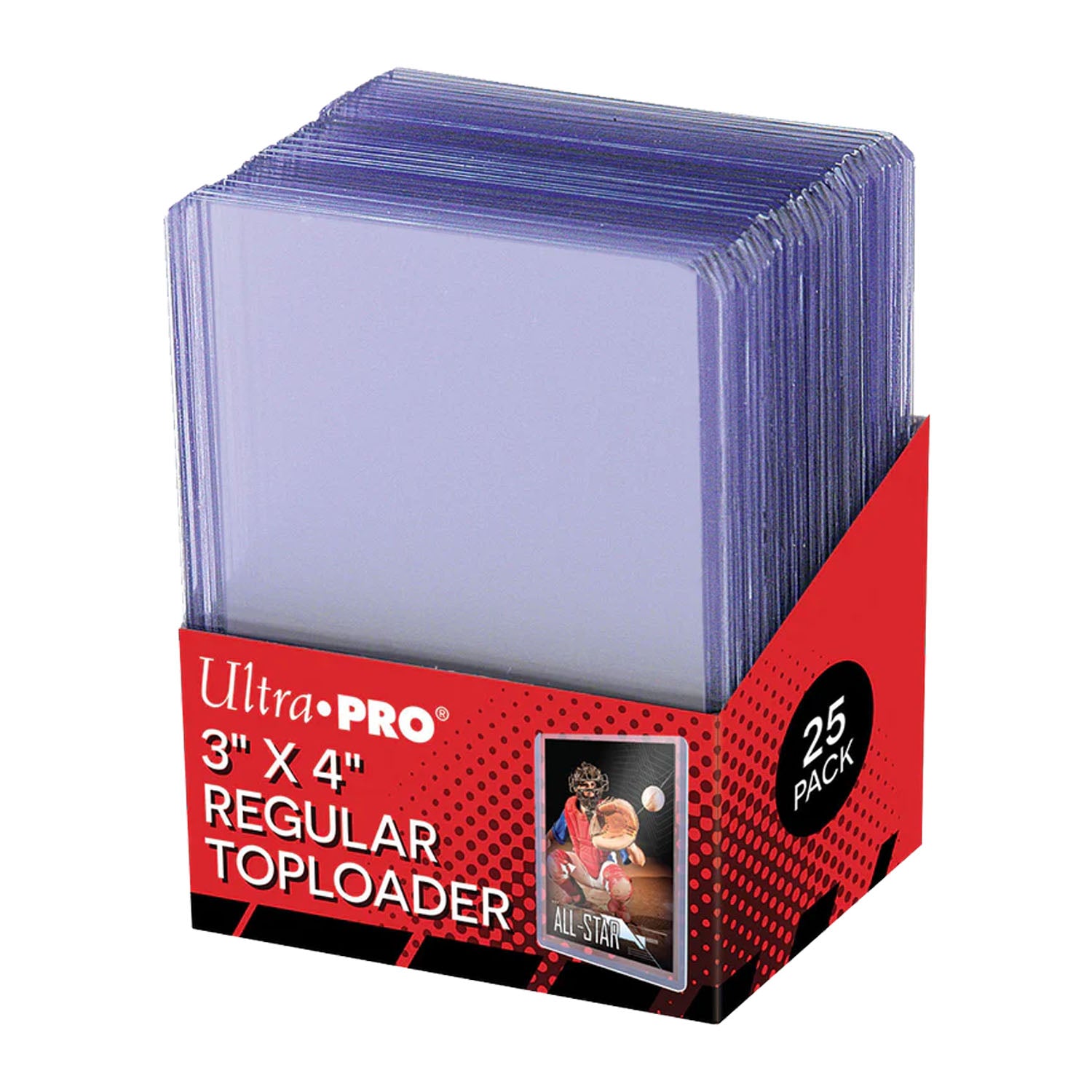 These rigid plastic protectors are made with super clear PVC to keep your cards safe for storage, display, during trade, and in shipments. With outer dimensions of 3" x 4", these Toploaders are designed to safely store standard size cards (2-1/2" x 3-1/2") up to 35 points in thickness. Each pack comes with 25 individual Toploaders.