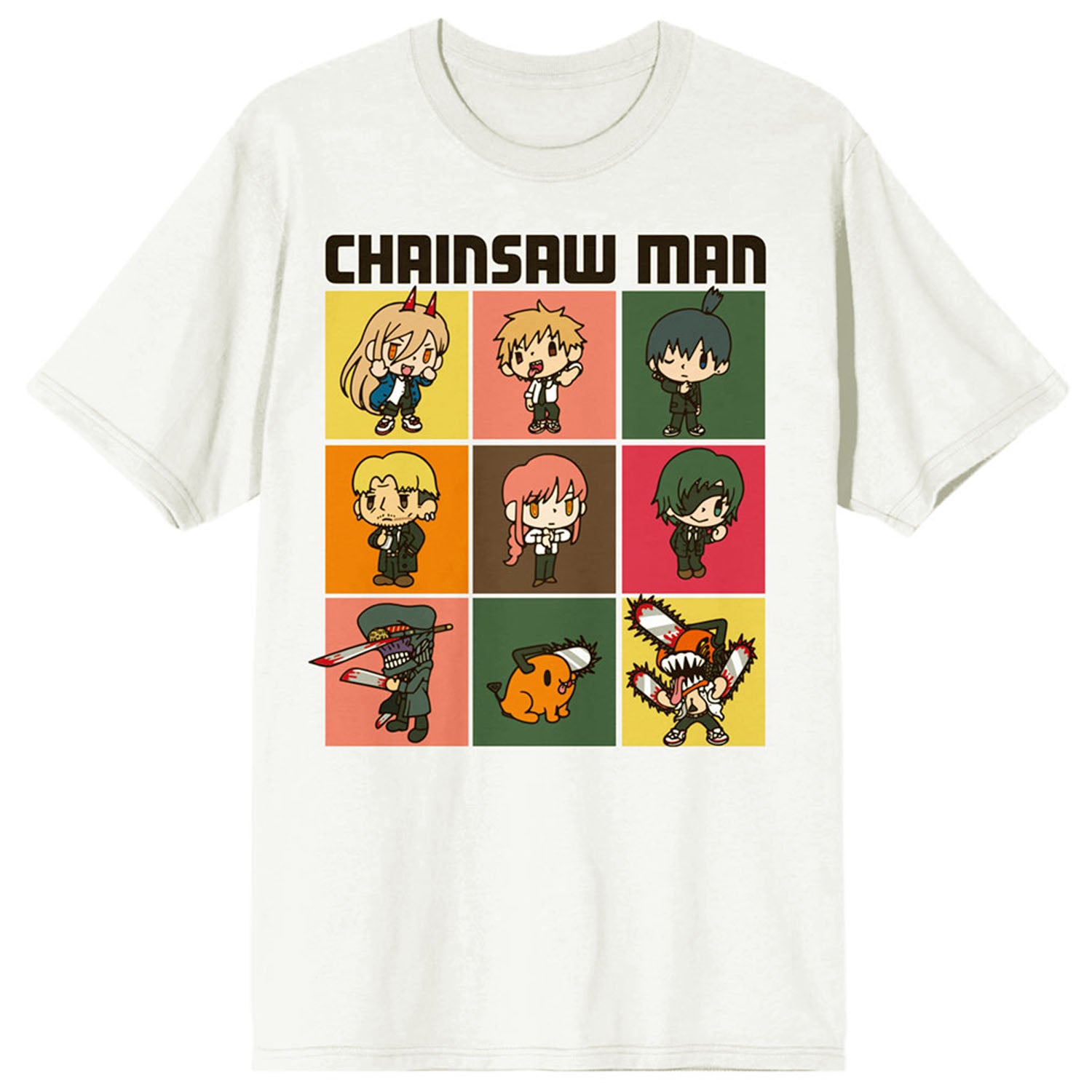Natural white color tee with fun, chibi graphic of Chainsaw Man characters. Listed in men's/unisex sizing. 60% cotton/40% polyester. Machine wash cold with like colors. Tumble dry low.
