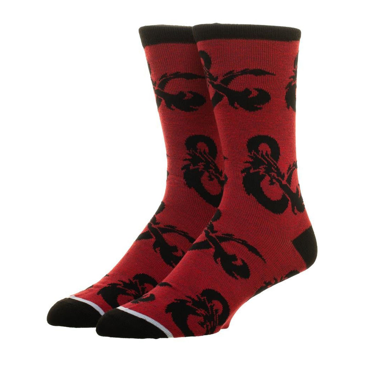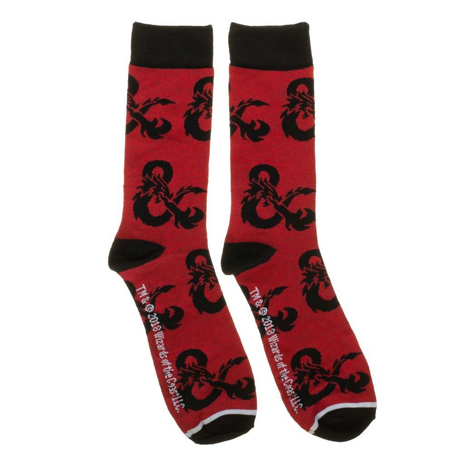 Cozy up for a game of DnD with these Dungeons & Dragons Ampersand socks. Deep red hue with black ampersand logo. Deep heel & toe pockets for greater comfort. High-quality polyester for a softer handfeel (98%poly/2%spandex). Fits men shoe sizes 8-12. Machine wash cold with like colors. Tumble dry low.