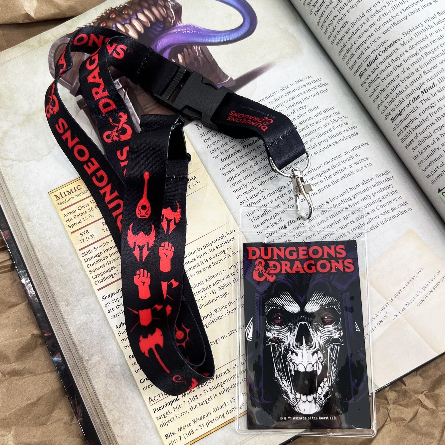 Keep your keys and/or ID handy with this Dungeons & Dragons lanyard with pocket. Lanyard includes metal lobster clasp keyring, a breakaway plastic clip, and detachable clear ID pocket. Dual-sided print of D&D class icons on lanyard. Not including ID pocket, lanyard measures approx. 21" long.