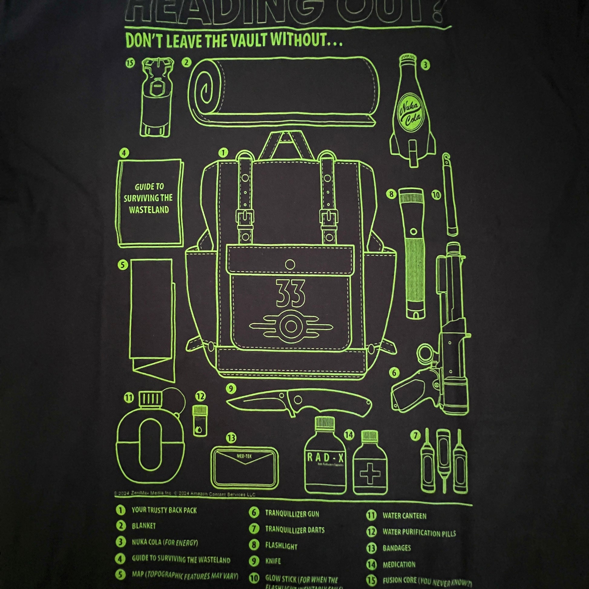 Planning to head out into the Wasteland? Don't forget the essentials! Black t-shirt with neon green screenprint of Vault Boy on the front and a list of items to survive outside Vault 33 on the back. Men's/Unisex sizing. 100% Cotton.