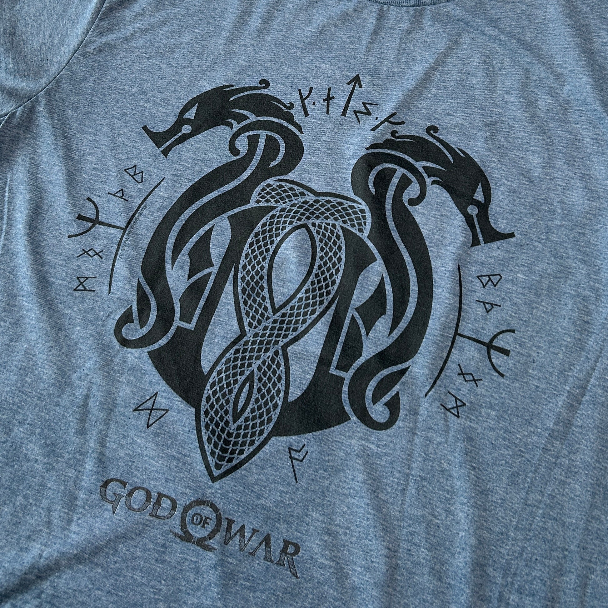 Grey-ish blue color tee with black Norse snake graphic on front from PlayStation's God of War franchise. 65% poly/35%cotton. Men's/Unisex fit.