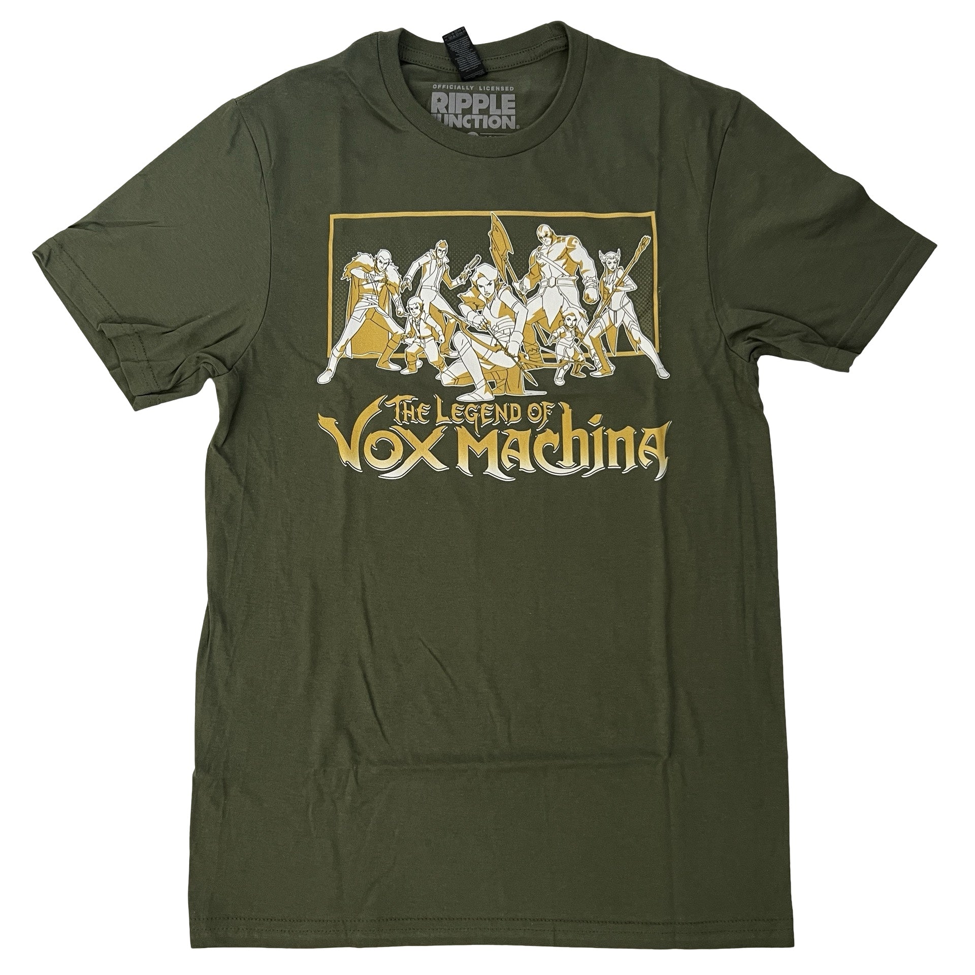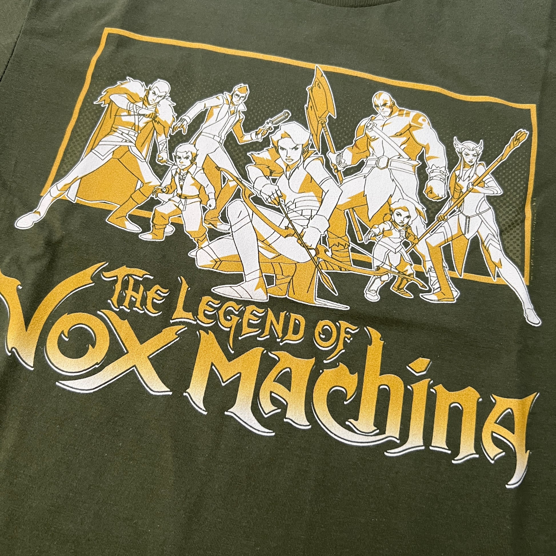 Bidet! The gangs all here. Celebrate the iconic, OG party from Critical Role's first campaign. Olive green tee with goldenrod and white screenprint of artwork from the crew's animated series, The Legend of Vox Machina. Men's/Unisex sizing. 100% Cotton.