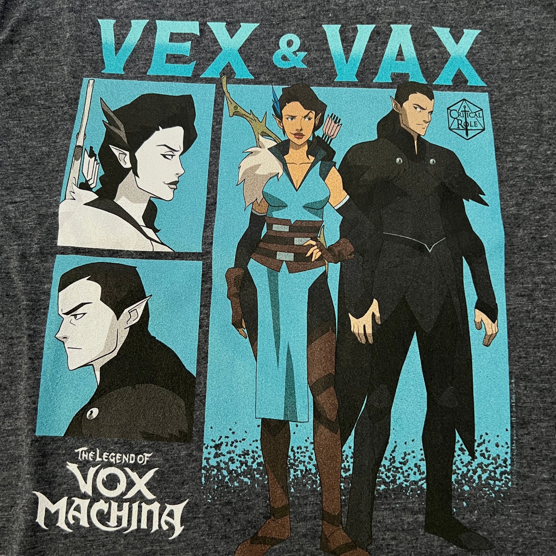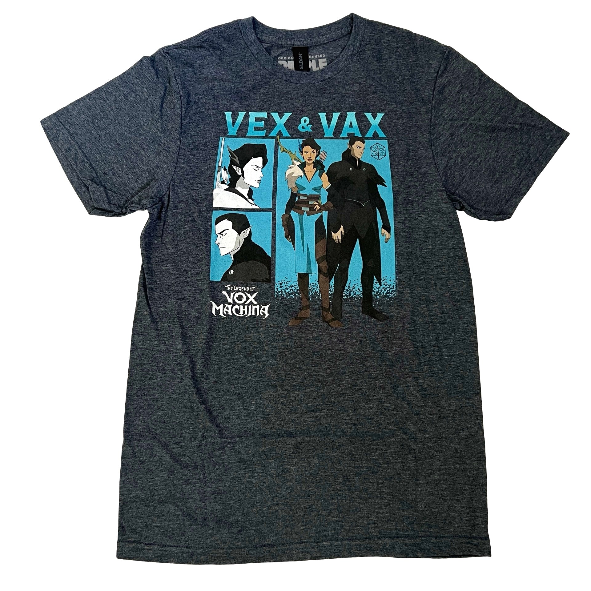 Name a more iconic duo. We love a supportive sibling moment. Celebrate the twins with this heathered, navy color tee with teal/multi-color screenprint of their Legend of Vox Machina likeness. Men's/Unisex sizing. 65%Poly/35% Cotton Blend.