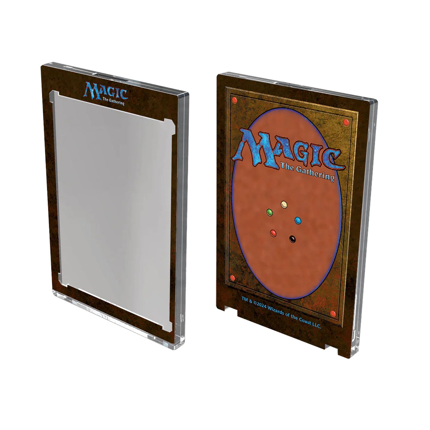 Keep your treasured Magic the Gathering card safe in this One-Touch Edge case from Ultra Pro. Fits standard-size Magic the Gathering card up to 35pt of thickness. Iconic MTG card artwork on back and front border. Diamond corners to keep cards in mint condition. Made with non-PVC materials and UV-blocking additives for premier protection. Slide-in hinge and magnetic closure.Â