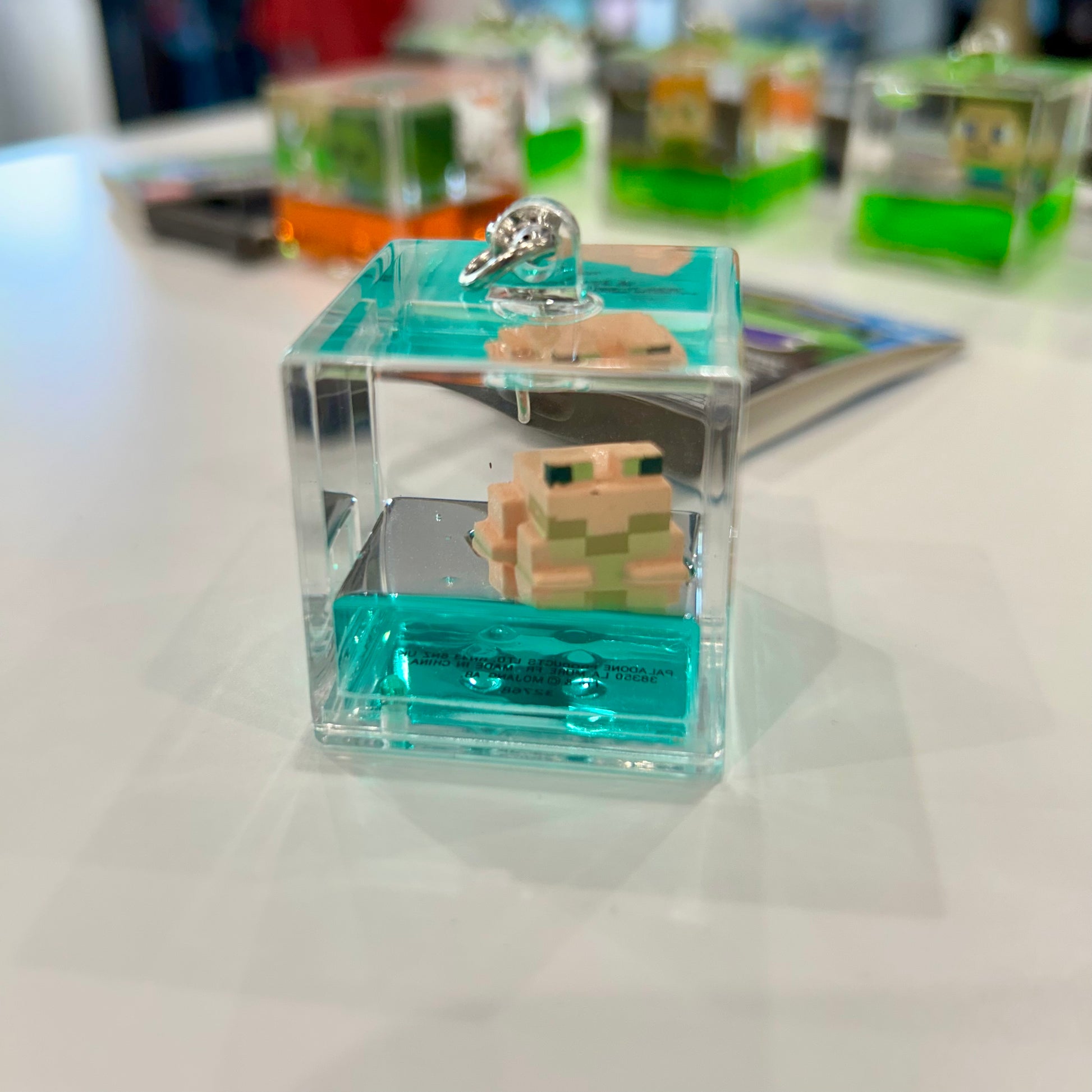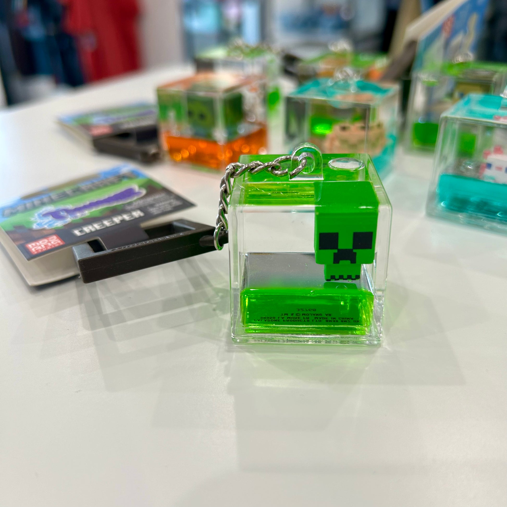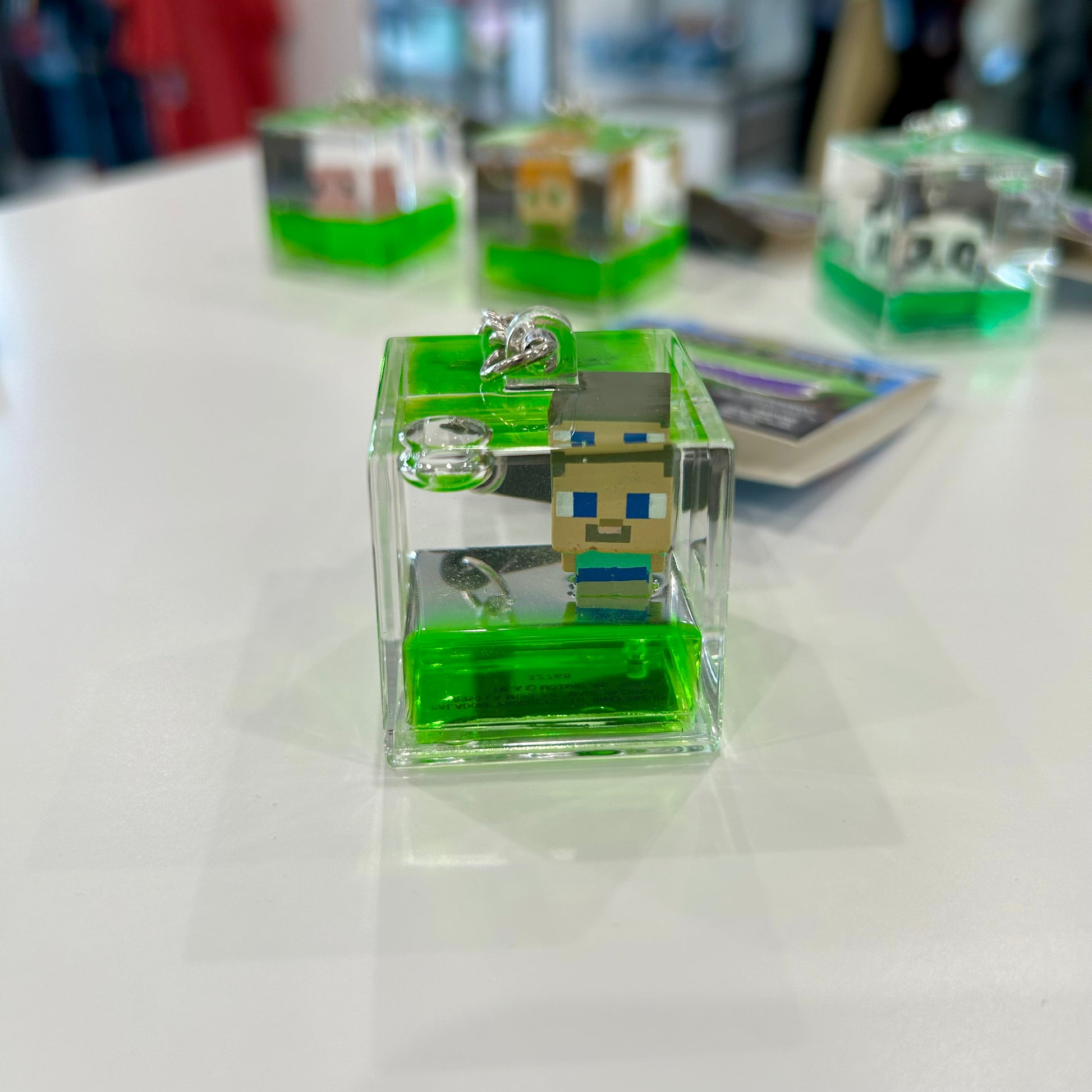 Each acrylic cube features water inside with a floating Minecraft character! Attach to your keys, book bag, or other item with a plastic clip. Each cube measures 1.25" x 1.25". Length of keychain measures about 4.75" long.