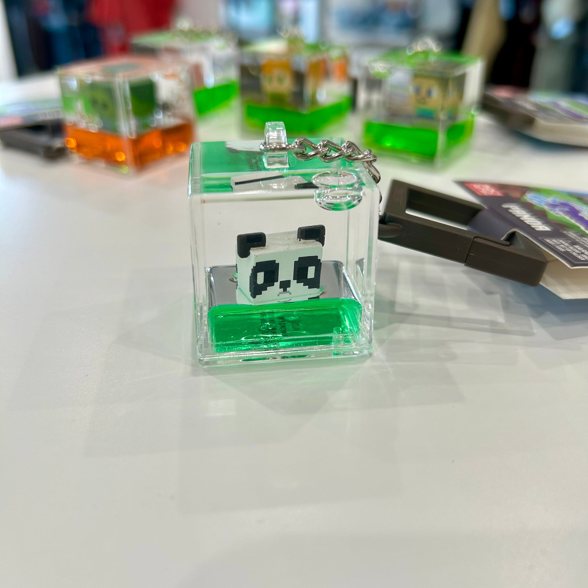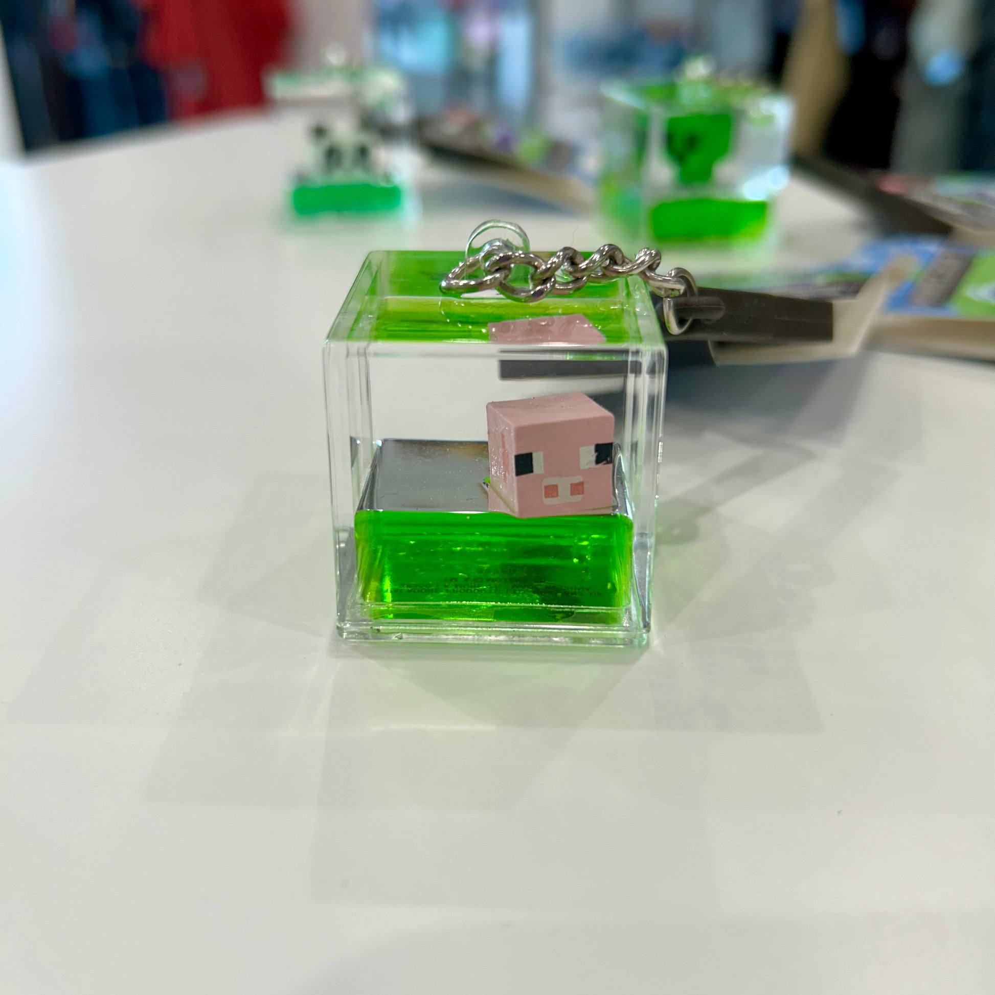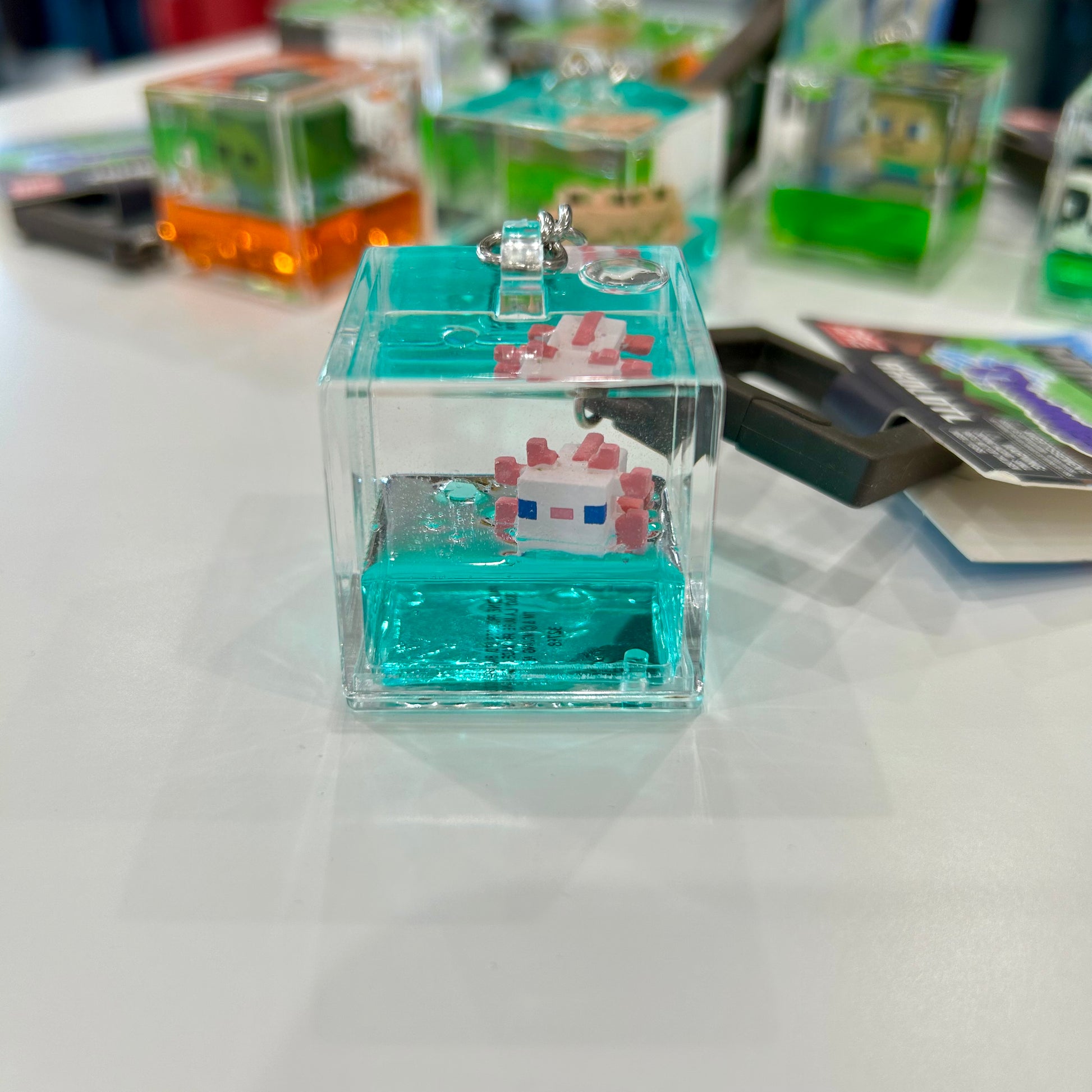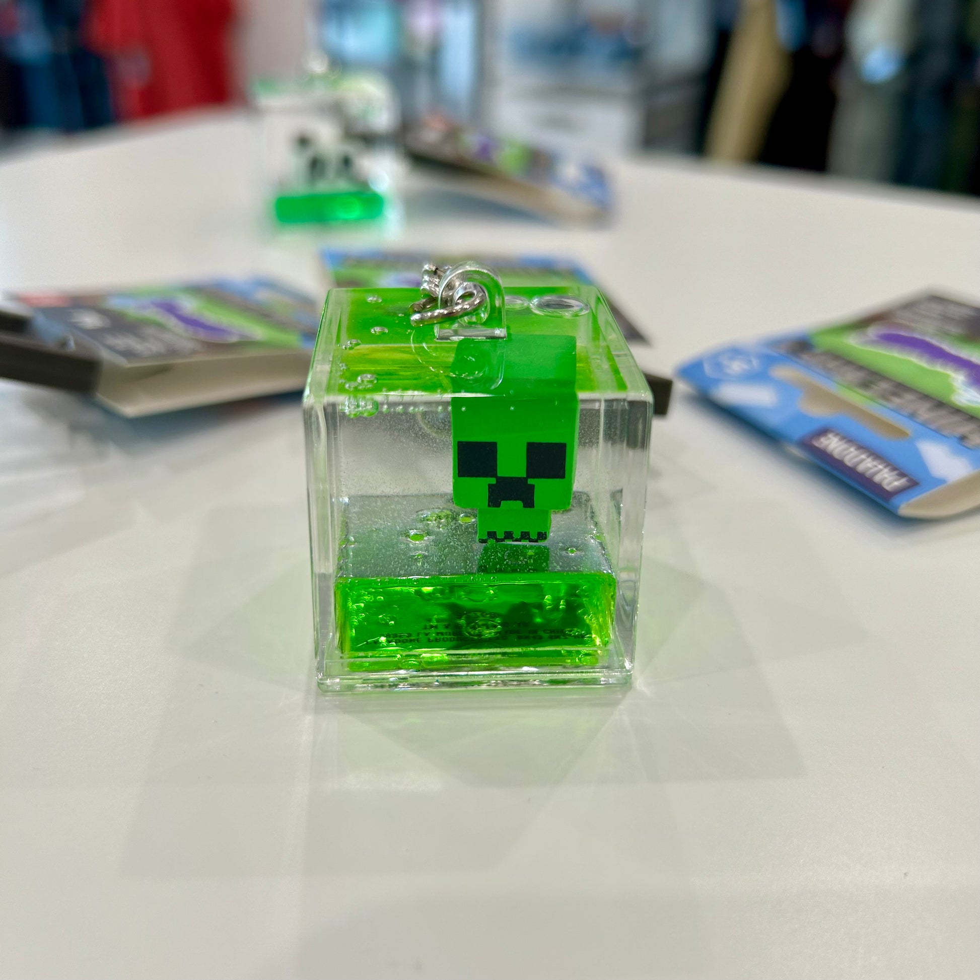 Each acrylic cube features water inside with a floating Minecraft character! Attach to your keys, book bag, or other item with a plastic clip. Each cube measures 1.25" x 1.25". Length of keychain measures about 4.75" long.