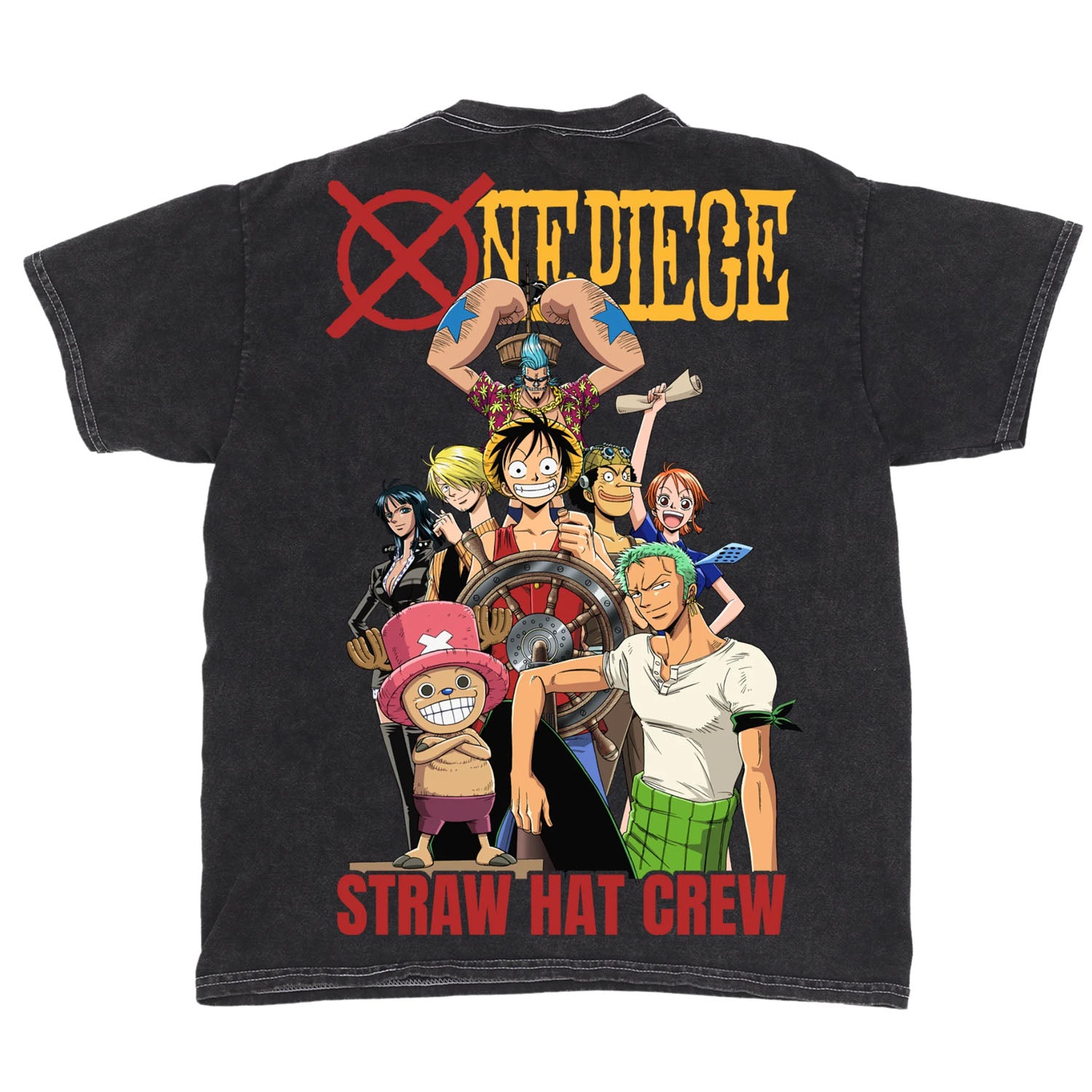 Vintage style, mineral wash tee with jumbo graphic of the Straw Hat Crew in red on the front and full color on the back. 100% cotton. Officially licensed.