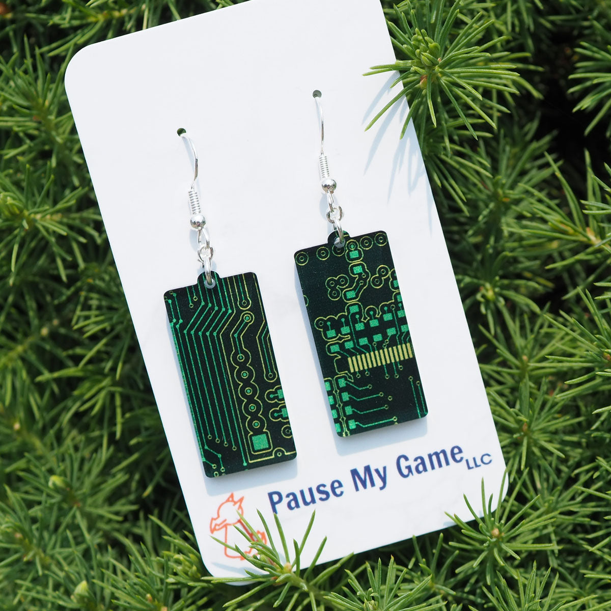 Acrylic charms with circuit board pattern. Charms measure 1.28" long. Hypoallergenic hooks. Pattern visible on front and back. Since each pair of earrings are cut from patterned acrylic, no two pairs will be the same meaning the design may vary slightly from what is shown.