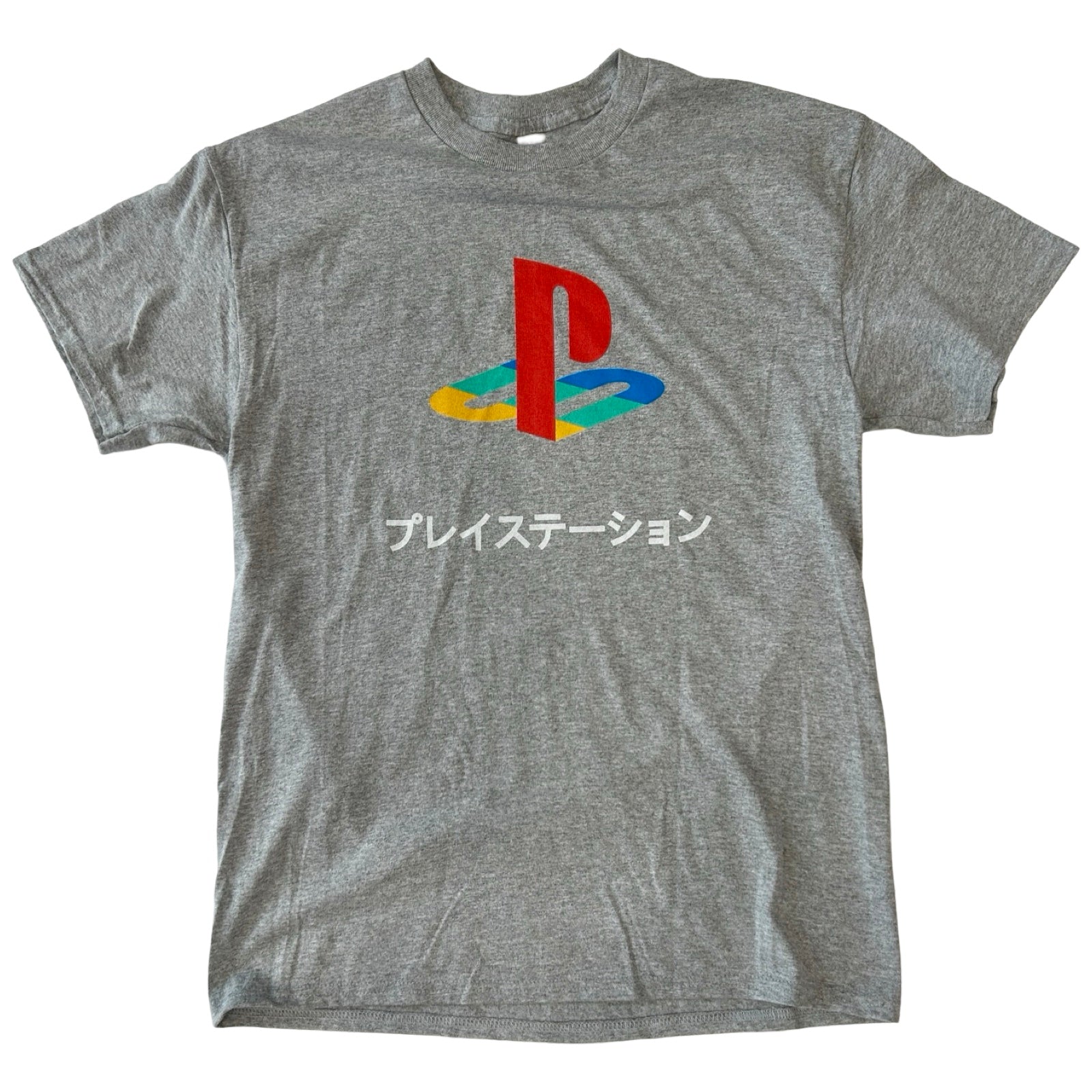 Broadcast your love for all things PlayStation with this logo tee. Heather grey tee with PlayStation logo and Japanese text that reads "PlayStation" below. 10% poly/90%cotton. Men's/Unisex fit.