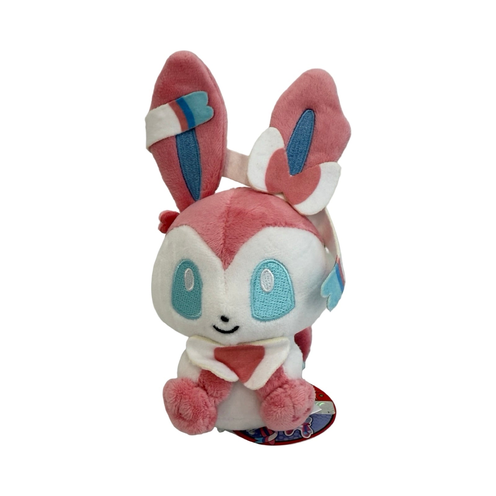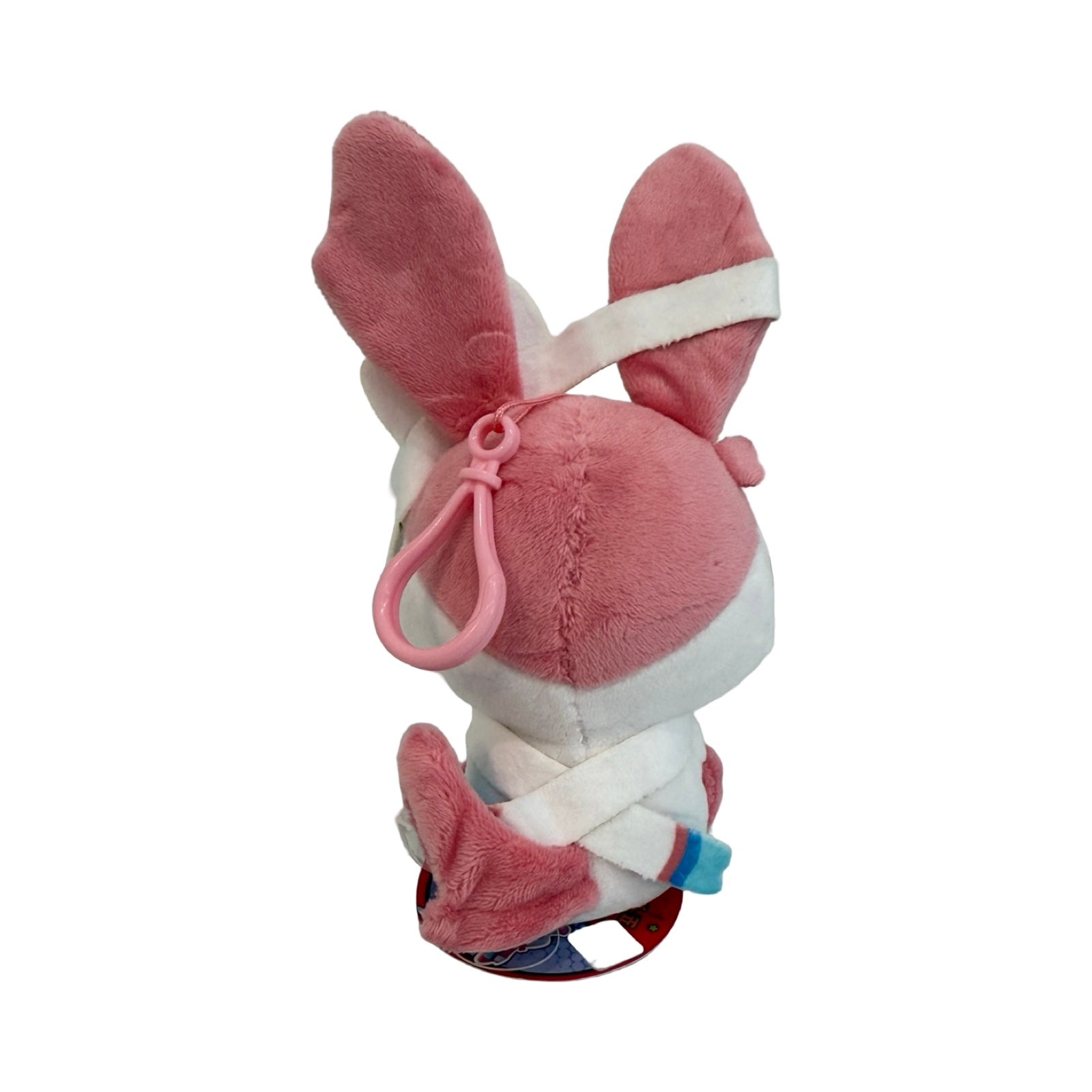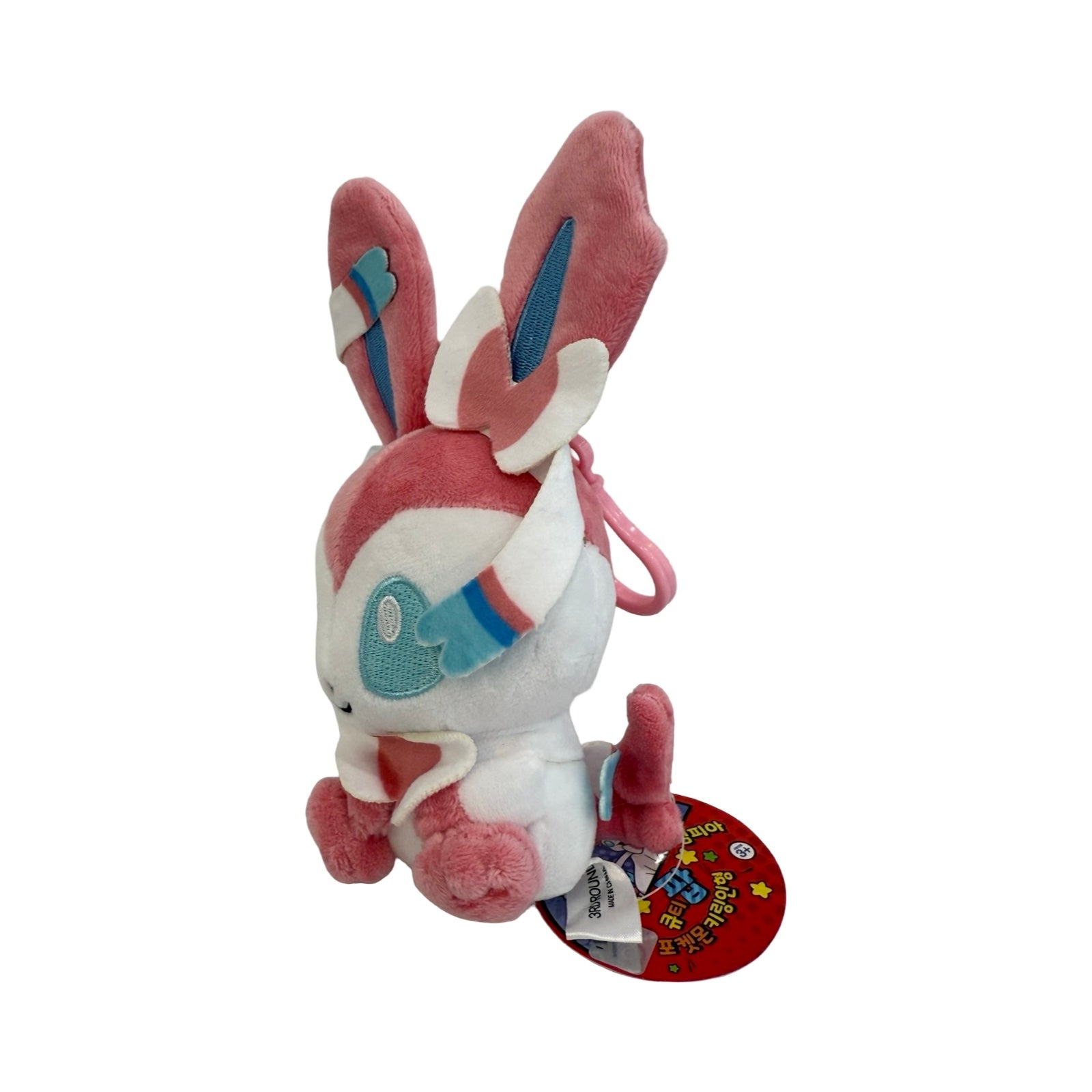 Adorable plush Sylveon is in a sitting pose with an oversized noggin' and adorable giant ears. Soft plush material with embroidered details. Attached pink, plastic clip to hook onto your keys, bag, or other item. Measures about 6" tall not including clip.