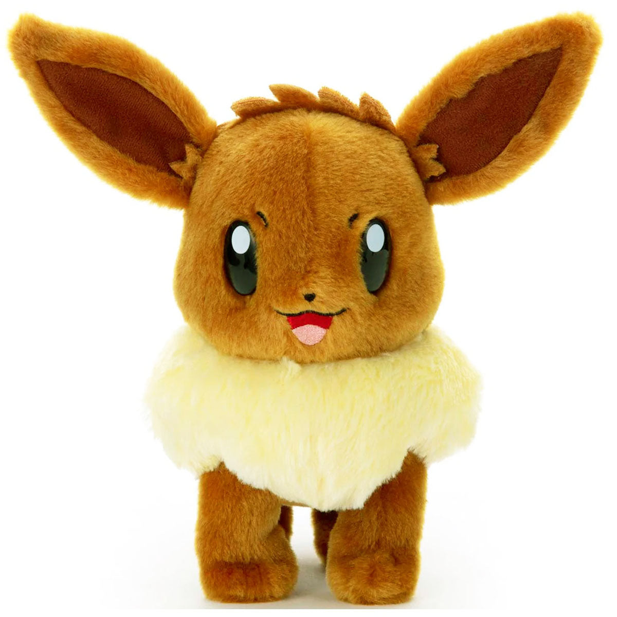 Super soft Eevee plush measures about 6.5" tall and is in a cute standing pose. Minky soft fur with hard bead eyes and embroidered details. Super plush collar/mane and puffy tail. High-quality collector plush.