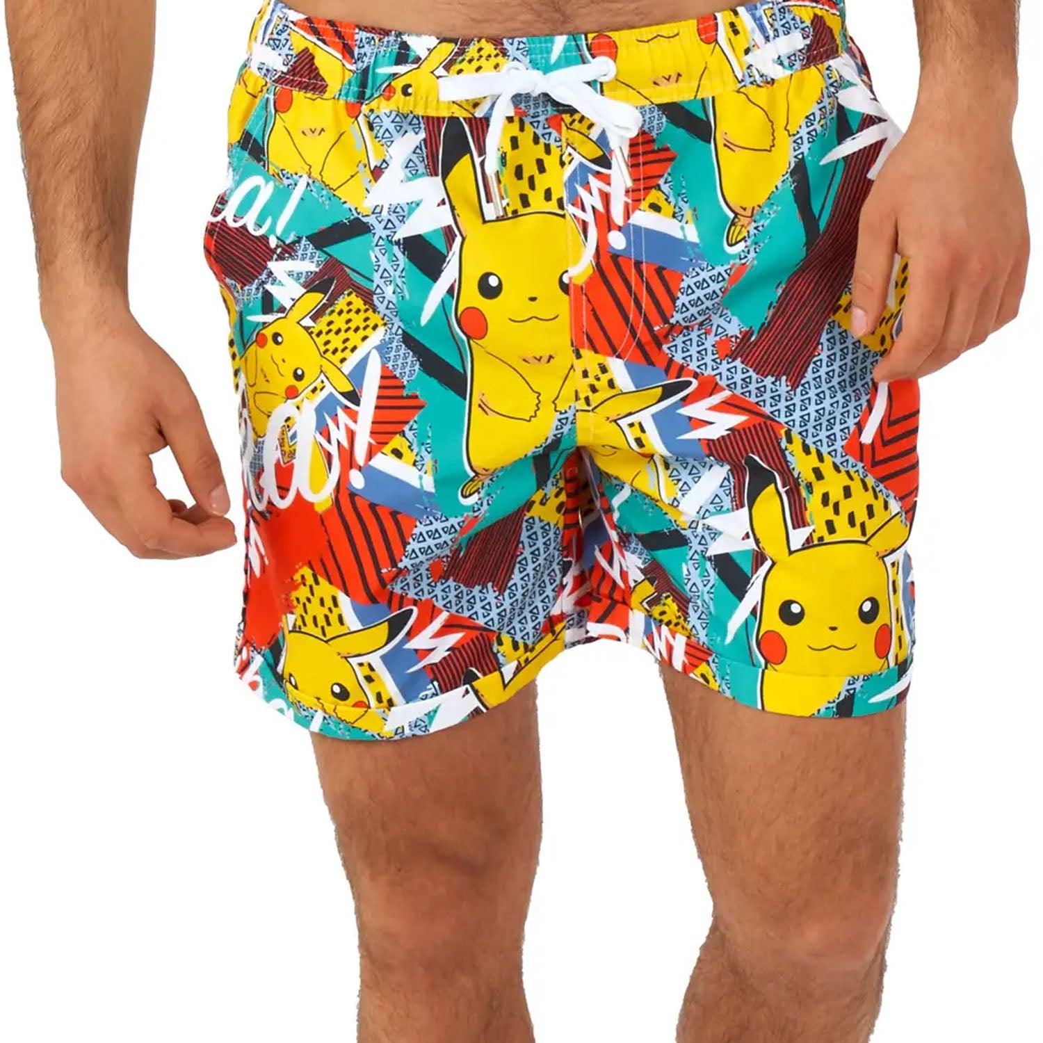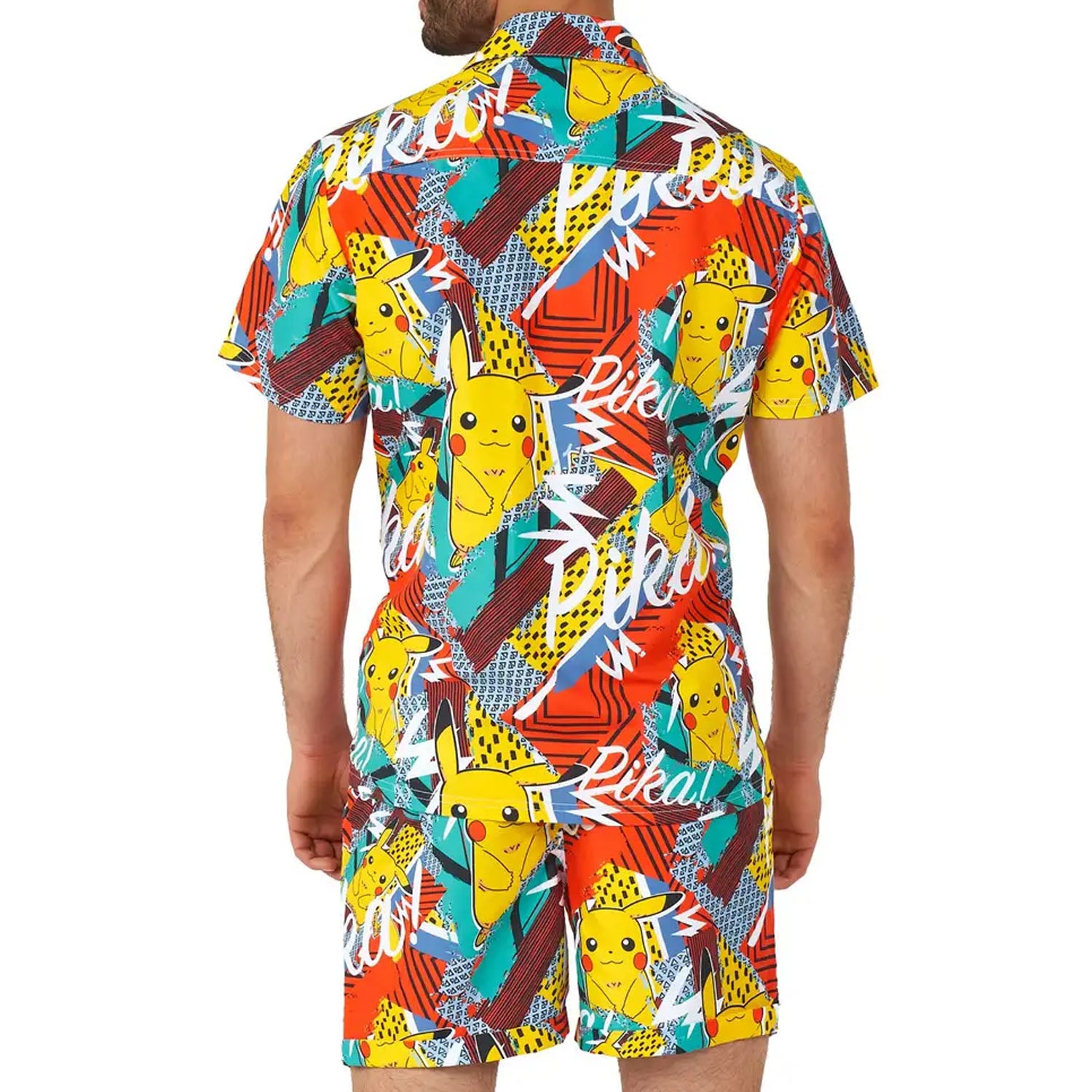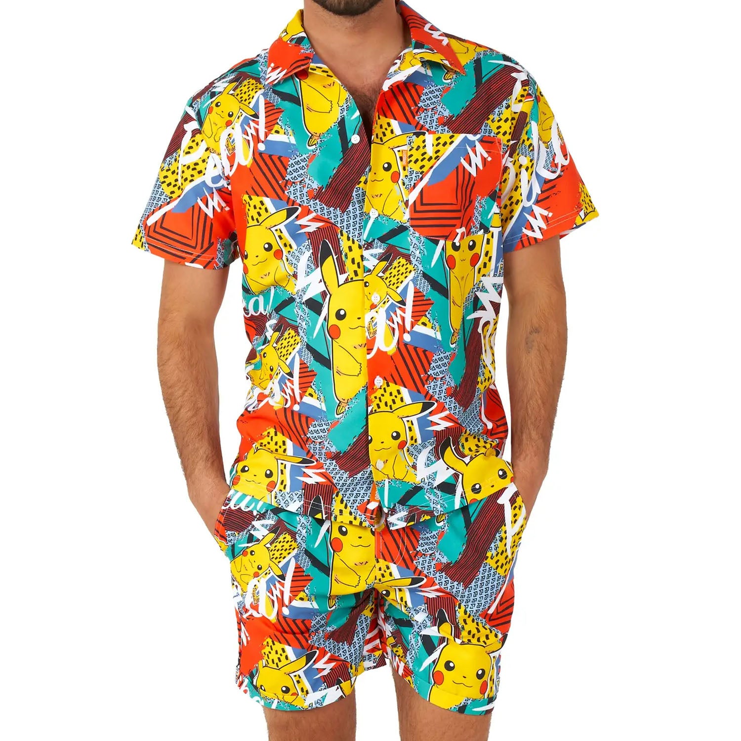 Resort-wear never looked so good. Matching men's two-piece set includes a button-down shirt and adjustable waistband shorts with drawstring tie. 90s-esque summer print includes Pikachu amongst tropical color graphics. Shorts have pockets on either side and one bum pocket. Relaxed fit. 100% Polyester. Machine washable.