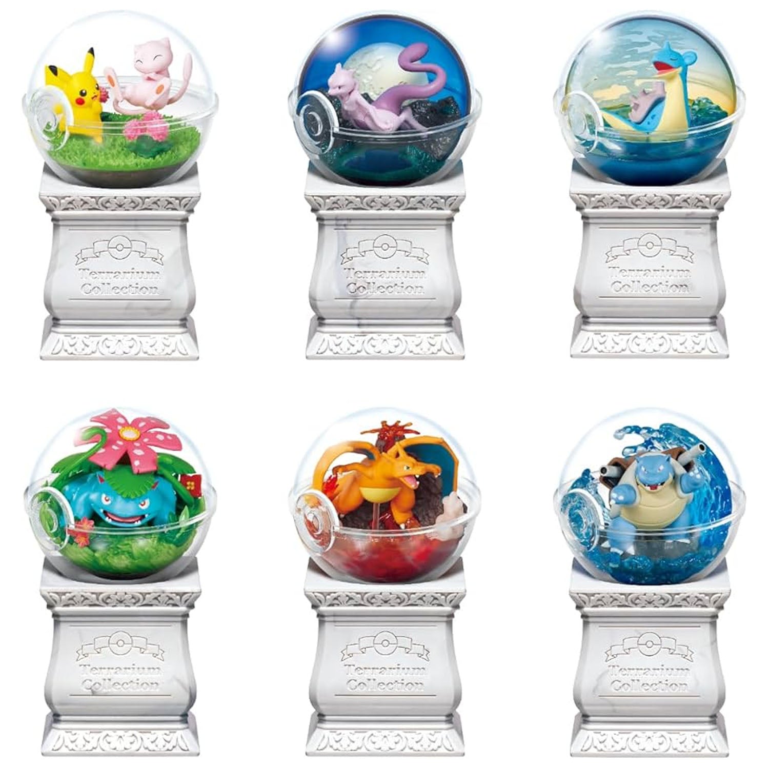 Each surprise box contains a Pokémon(s) displayed in a clear, terrarium-style Pokéball. Sits in provided, decorative base. Assembled figure measures about 4". Minor assembly required. Made from PVC, ABS, and acrylic. 6 to collect.