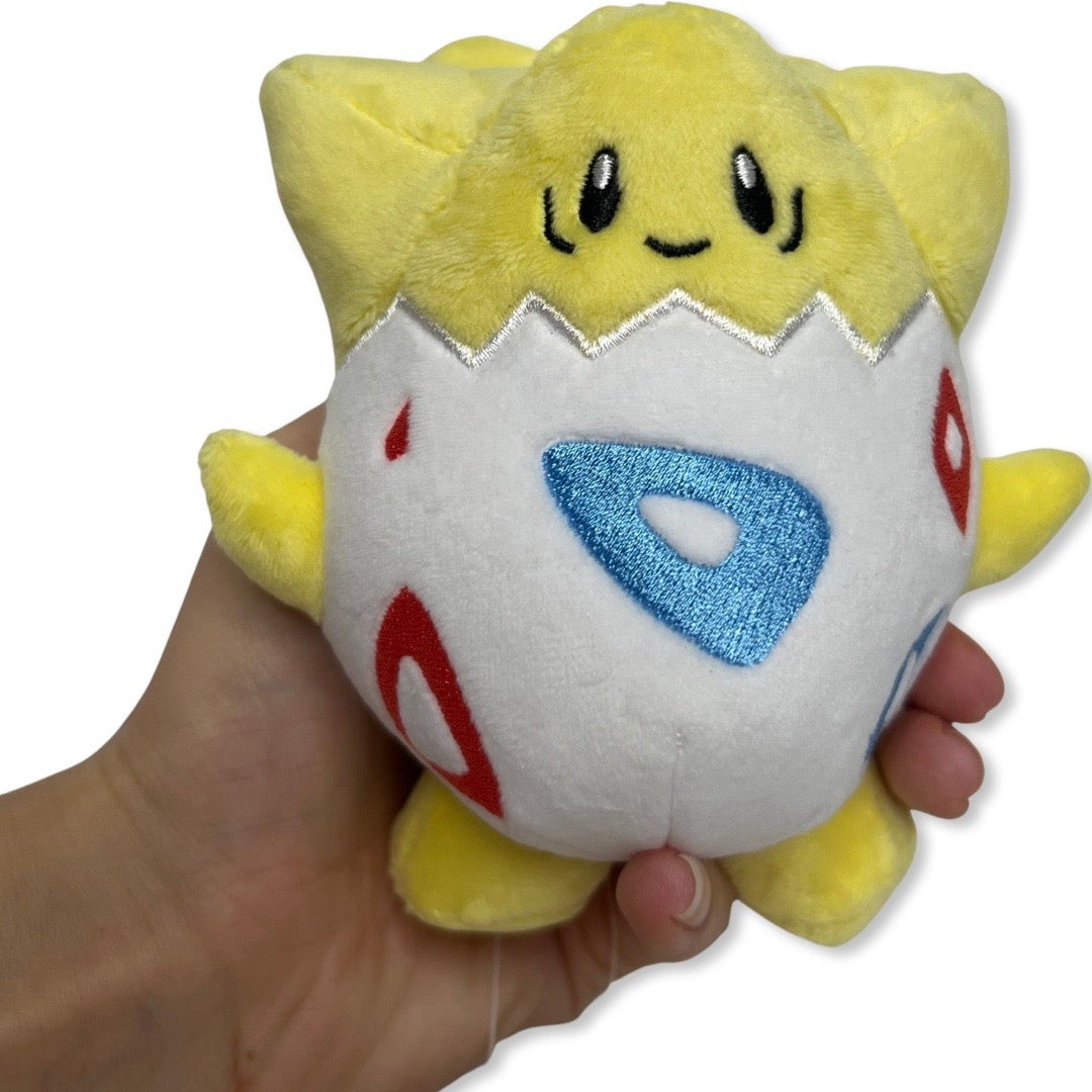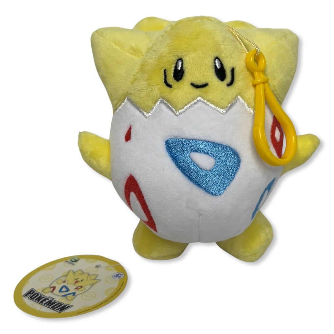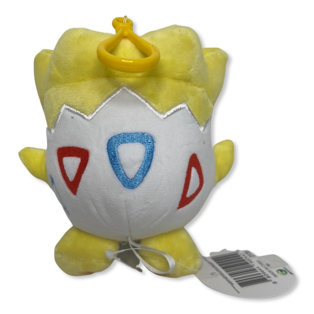A baby. This Togepi mini plush includes a plastic clip to hand off a bag or belt loop. Soft to the touch with embroidered details. Measures approx. 5" tall not including clip.