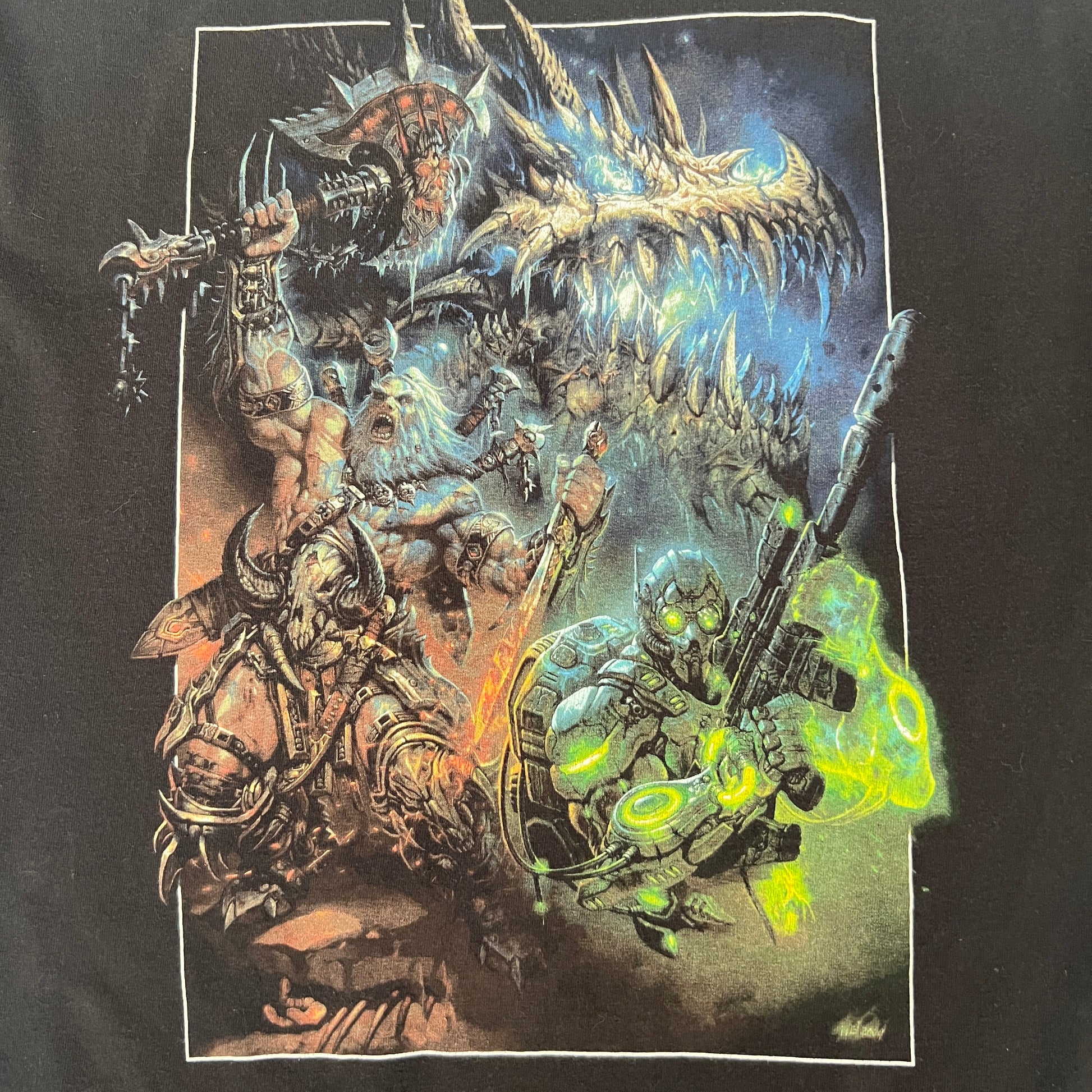 Super rad BlizzCon 2009 event tee by J!NX ft. art by Wei Wang. Fading from wash and screenprint cracking. Adds to that rad vintage look! Circa 2009. Marked men's size XL.