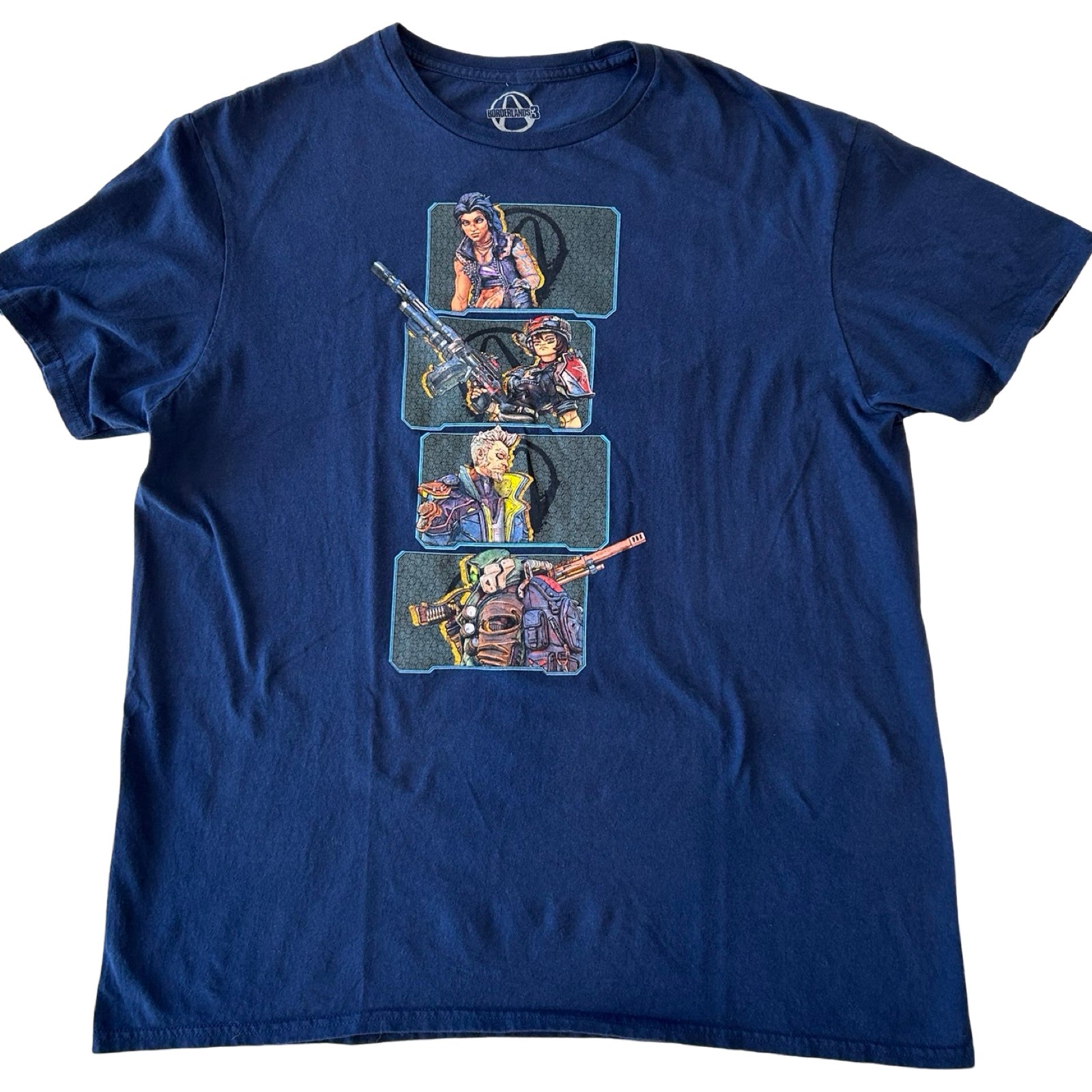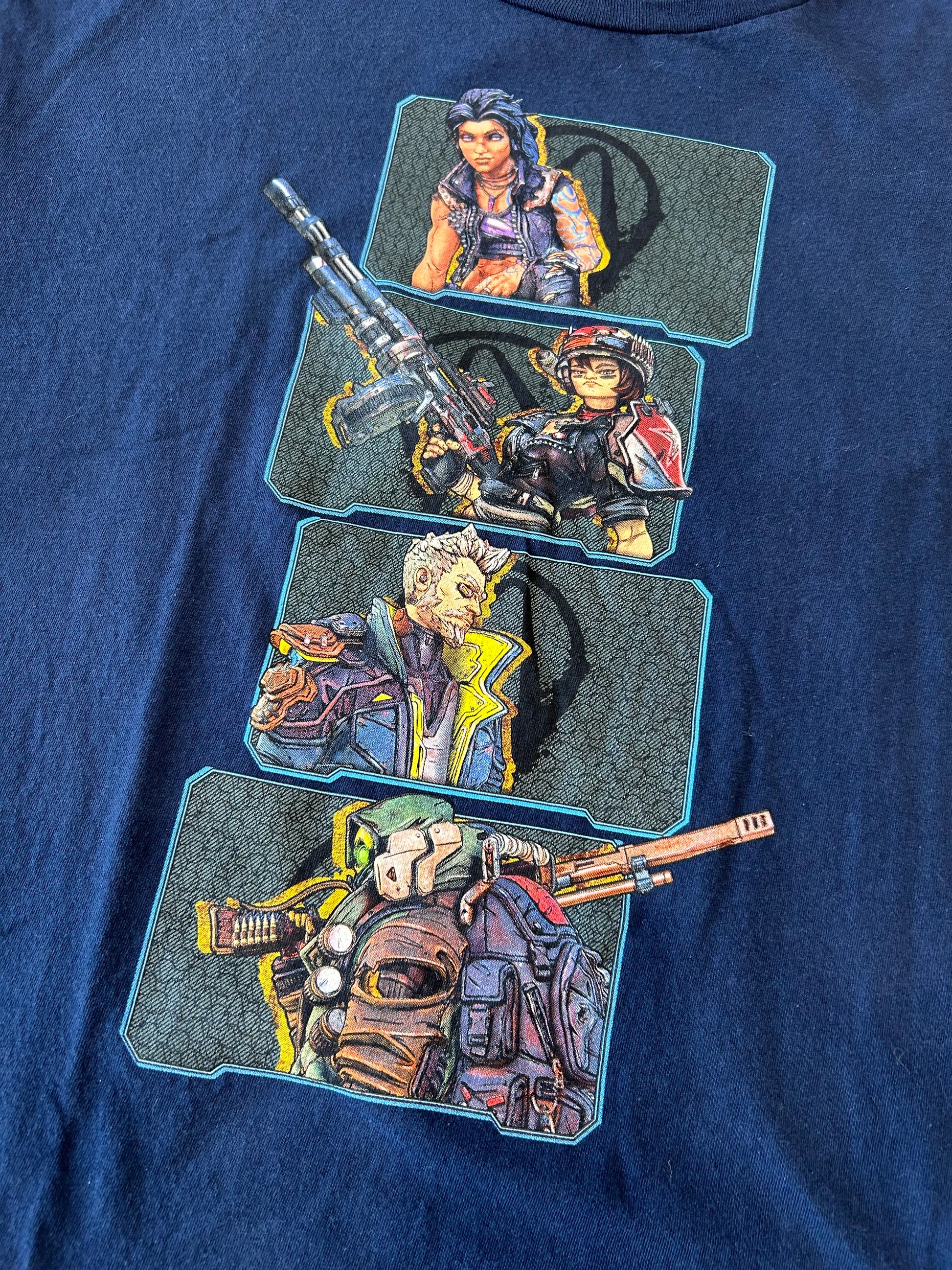 Navy tee with Borderlands 3 character select graphics down the front. Good condition. Marked men's size XL but feels more like L. Circa 2019.