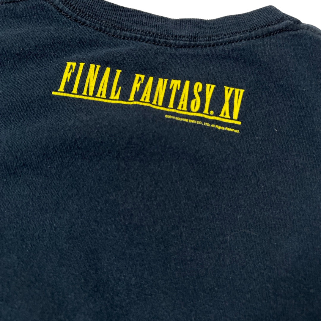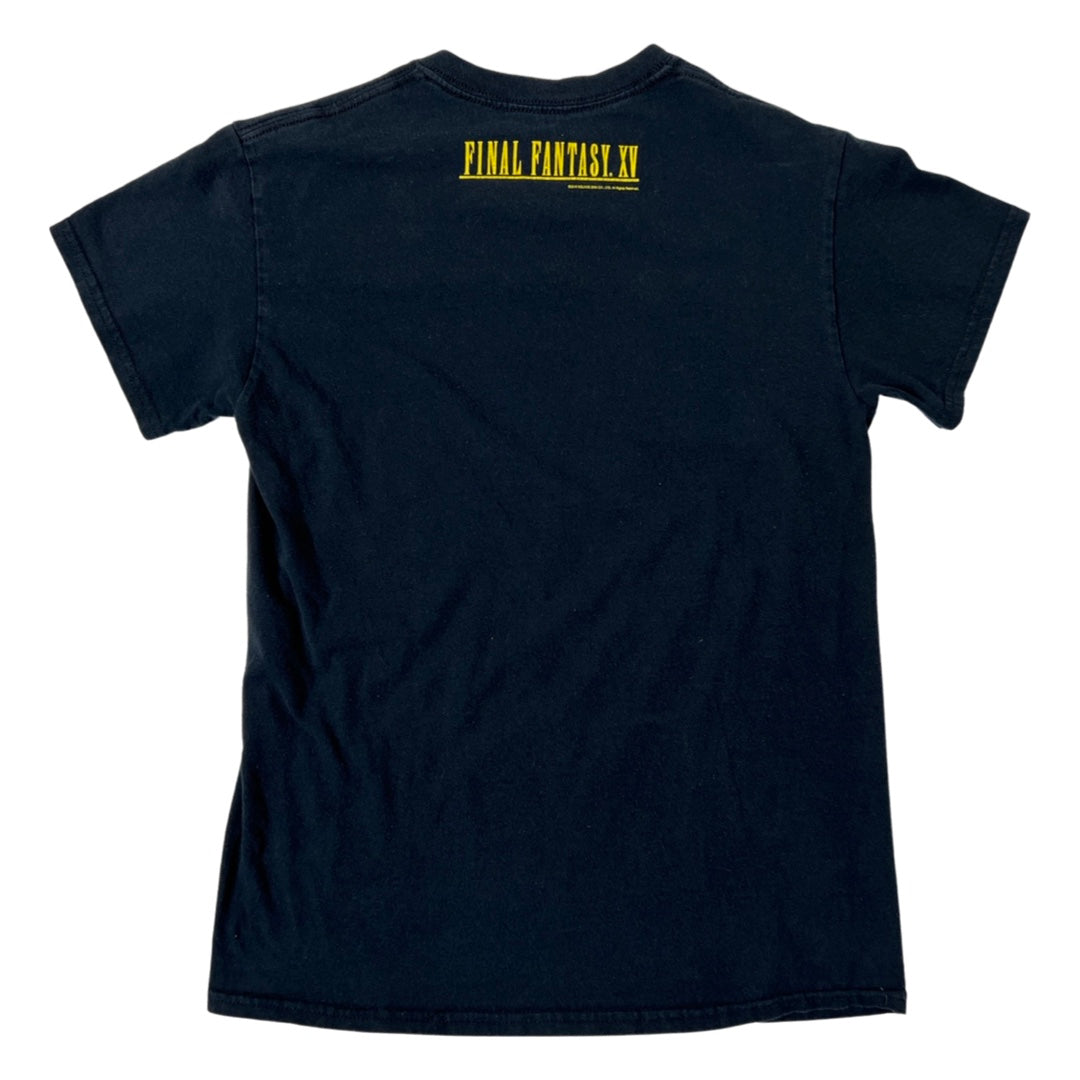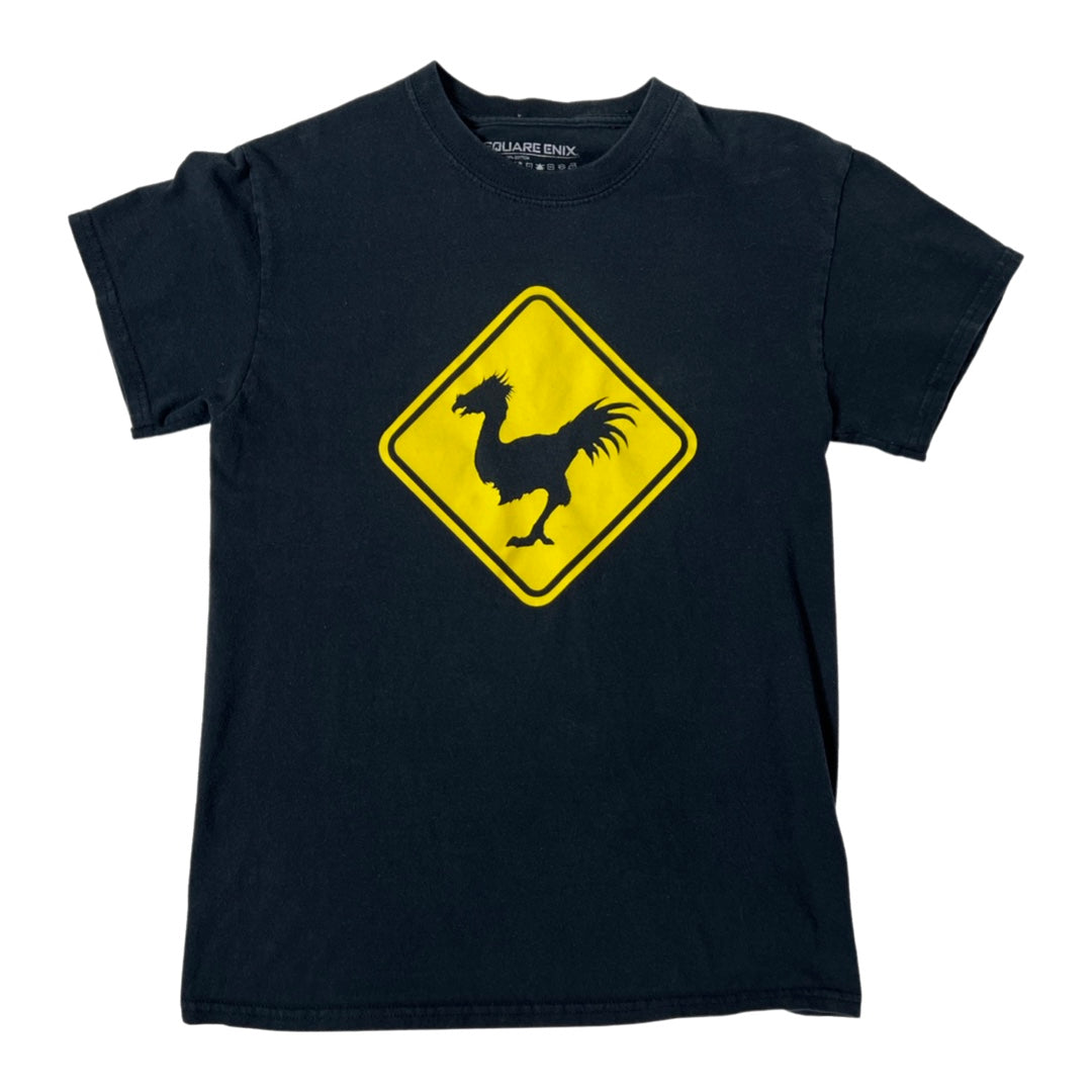 Get on losers, we're going adventuring. Official Square-Enix Final Fantasy XV Chocobo Crossing t-shirt. Black t-shirt with Chocobo sign graphic on front and Final Fantasy XV logo on back. Marked Unisex/Men's size small. Circa 2016. Some discoloration and fading from wash. Back screenprint has noticeable cracking. Small mark of discoloration on front graphic.Â