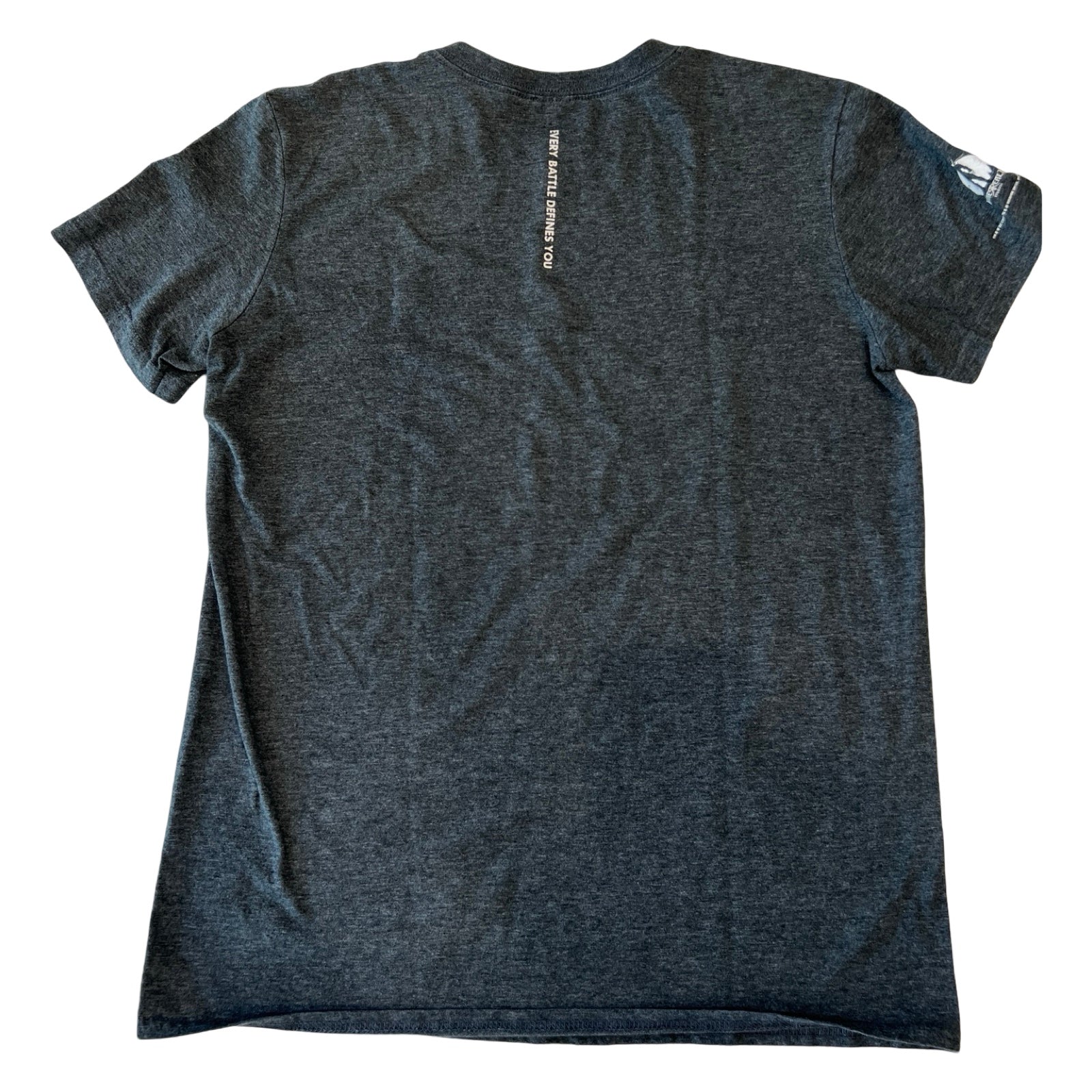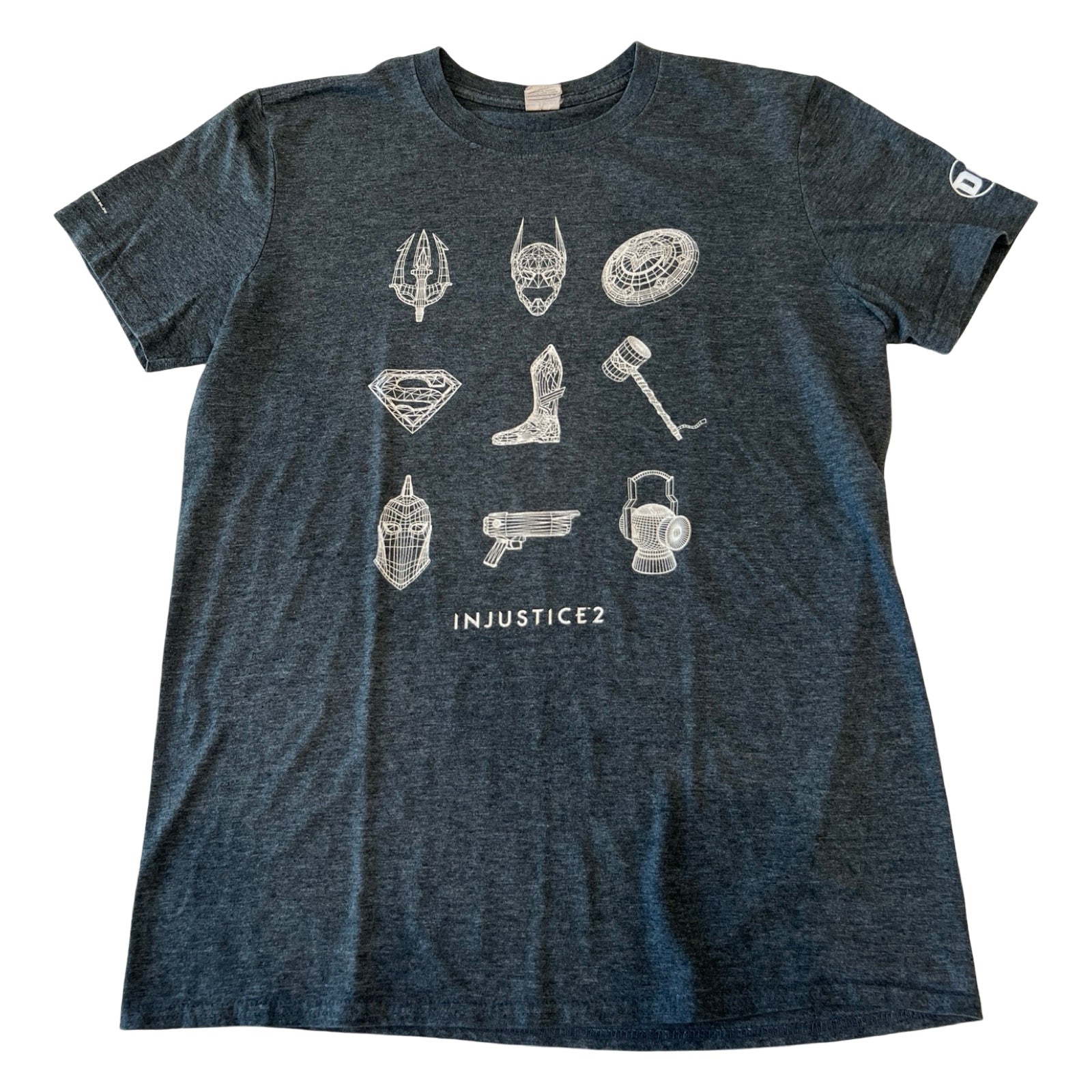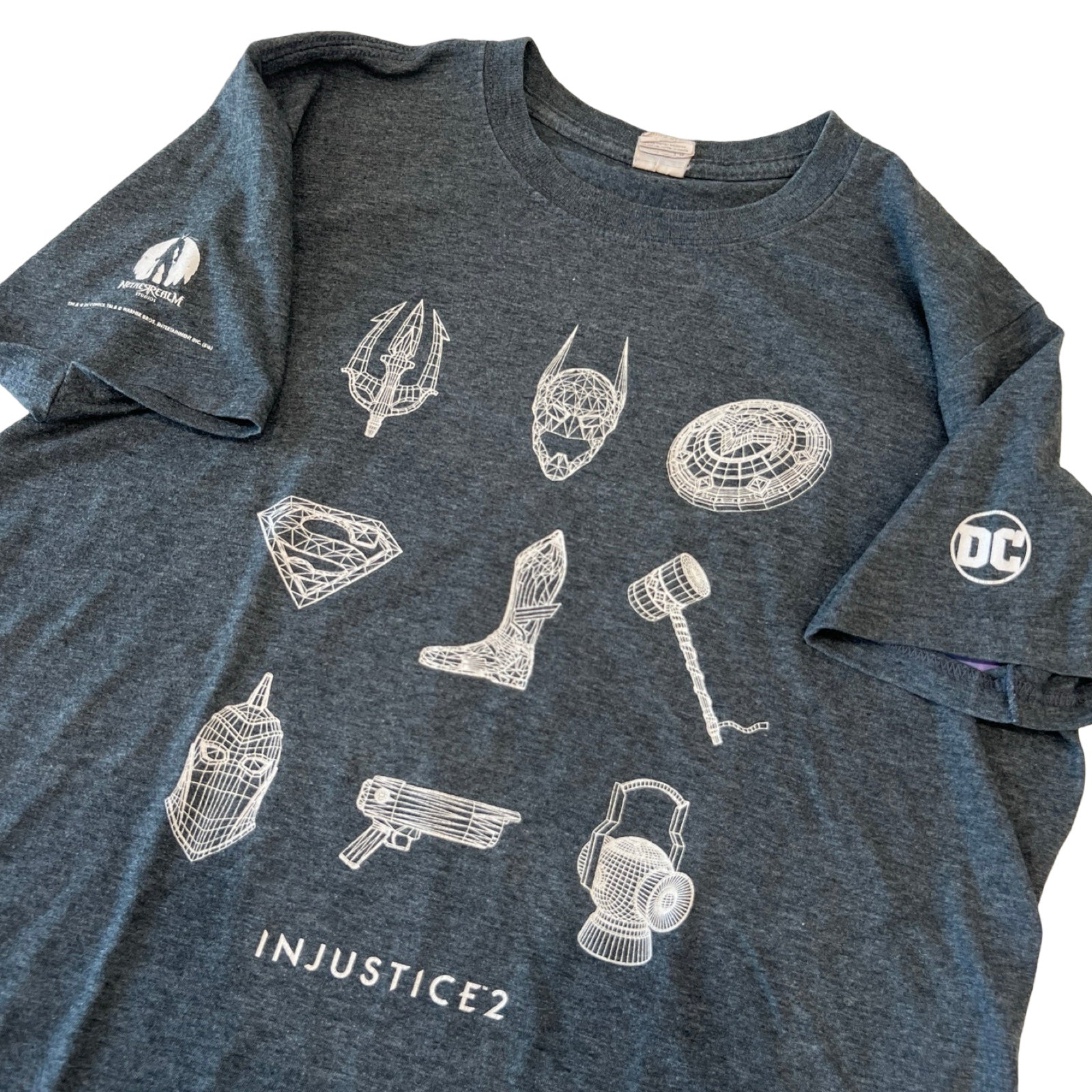 Charcoal grey tee with wire frame art of characters icons from Injustice 2. DC graphic on left sleeve, NetherRealm logo on other. Minor wear from wash. Circa 2017. Marked men's medium.
