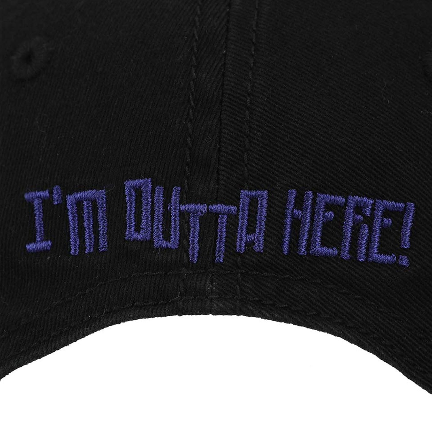 Unstructured, black hat with embroidered 8-bit Sonic the Hedgehog graphic on front. "I'm Outta Here" text embroidered on back. Adjustable sizing with metal slide closure. Cotton.