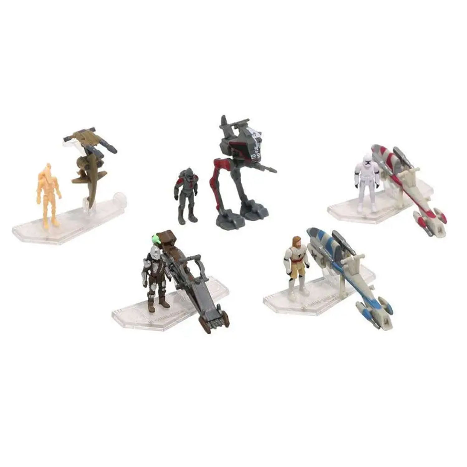 Each blind box includes 1 micro Star Wars vehicle and figure. Figure measures about 1" tall, matching vehicle measures about 2" long. Flight stands are included for figures that won't stand on their own. 8 to collect!