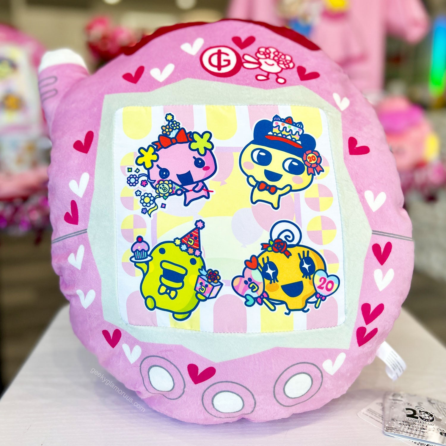 Celebrate the 20th anniversary of the Tamagotchi Connection (the re-release of the original Tamagotchi) with this adorable plush! Made to look like a Tamagotchi Connection device, this cuddly plush features artwork of Tamagotchi characters celebrating surrounded by pink and white hearts. Measures 15" x 13" x 3".