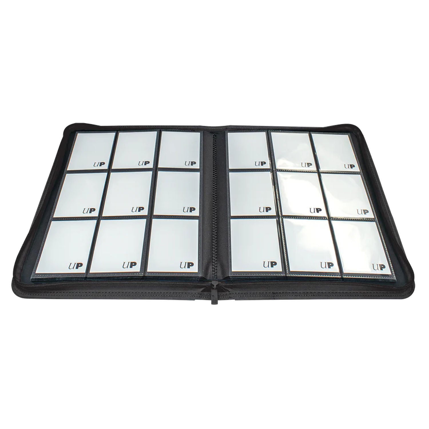 Display and keep your cards secure in this card binder. Padded leatherette cover with matching zip-around closure. Once open, you'll find twenty 9-pocket pages that can store up to 360 cards in Deck Protector sleeves. Side-loading pages with low-friction black backing. Made with acid-free, non-PVC materials to ensure your cards are protected and preserved.Â